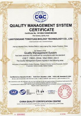 企業(yè)質(zhì)量方針科學(xué)化,精細(xì)化的管理 ----------追求出色品質(zhì)企業(yè)建立了完善的質(zhì)量確保體系,實(shí)施ISO22000-9000質(zhì)量管理,配備了經(jīng)過專業(yè)培訓(xùn)和考核的質(zhì)量人員和完整的分析儀器,對從原材料供應(yīng)、產(chǎn)品生產(chǎn)、包裝、儲藏到運(yùn)輸?shù)娜^程實(shí)施監(jiān)督管理,并制定了一系列質(zhì)量標(biāo)準(zhǔn)管理程序(SMP),標(biāo)準(zhǔn)操作程序(SOP)和標(biāo)準(zhǔn)質(zhì)量指標(biāo)(STP)以確保產(chǎn)品的品質(zhì)。 我們所持有的證書經(jīng)過多年的發(fā)展。連云港通源化工有限公司至今已有的證書具體如下:衛(wèi)生食品許可證/Kosher/Halal/ISO22000-9000
